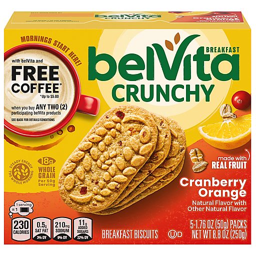 Start your morning off right with lightly sweet and crunchy belVita Cranberry Orange Breakfast Biscuits. These breakfast biscuits combine wholesome grains with cranberry orange flavor for a delicious breakfast. Specially baked, these biscuits contain slow-release carbs that break down gradually in the body to deliver delicious, steady energy all morning long so you can enjoy these with your morning coffee, yogurt and fruit or as an instant breakfast food no matter what the morning brings. Each 50 gram serving of these breakfast cookies contains 18 grams of whole grain, 2 grams of fiber and B vitamins for a delicious alternative to breakfast bars. A simple addition to your morning, these cholesterol-free cranberry orange cookies contain no high-fructose corn syrup and no artificial colors, flavors or sweeteners. What are you waiting for? These convenient breakfast biscuits made with wholesome grains are a great alternative to traditional breakfast snacks. These breakfast biscuits are also energizing alternatives to snack bars and wholesome additions to college care packages. Each individual pack contains four belVita Cranberry Orange Breakfast Biscuits for you to enjoy on the go, at the office or at home for lasting morning energy.