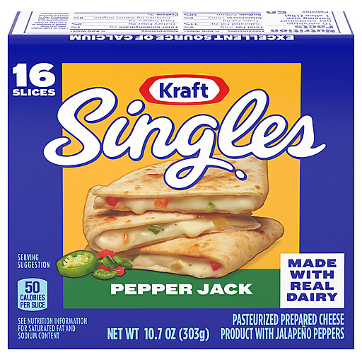 Delicious any way you square it, Kraft Singles Pepper Jack Cheese Slices deliver the classic taste and irresistible melt that take your favorite foods to the next level. Made with real dairy and no artificial flavors, our sliced cheese has a spicy, jalapeno pepper flavor and smooth, creamy texture that’s perfectly melty. Our simple squares are ideal for more than just grilled cheese. Try adding Kraft Pepper Jack Cheese Singles to burgers, quesadillas or pasta. Transform stuffed jalapenos into a sandwich with slices of pepper jack. When you’re craving classic comfort food, add America's favorite square to your mac and cheese for a simple joy that’s sure to make you smile. Each spicy cheese slice comes individually wrapped for convenience, so you can stack and snack any time. Kraft Singles Pepper Jack Cheese Slices contain 60 calories and 4 grams of protein per serving. For optimal creamy goodness, keep our pack of 16 cheese slices refrigerated.