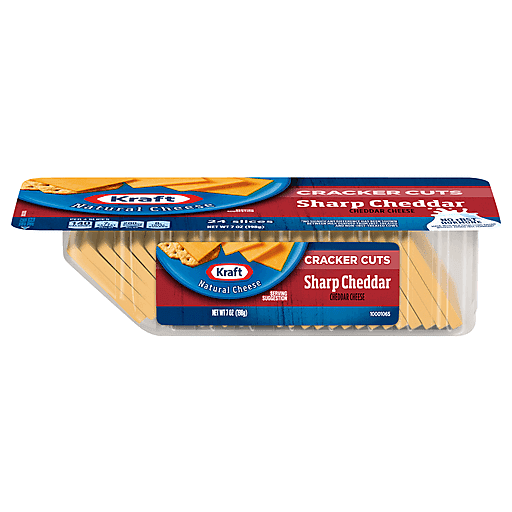 Kraft Natural Sharp Cheddar Cracker Cut Cheese Slices make it easy create delicious appetizers and snacks. Whether you're making up a party platter or giving the kids an after-school snack, this pre-cut cheese fits well with your favorite crackers and other small snacks. The tangy taste of sharp cheddar is the perfect complement on a delicious meat and cheese tray, or try it on top of flavored cracker for a salty, satisfying snack. If you prefer a little sweetness, add a slice of fresh fruit or a dab of jam to your cheese and crackers. Each serving of this cracker cut cheese contains 140 calories, and the convenient 7 ounce resealable tray makes for convenient storage.