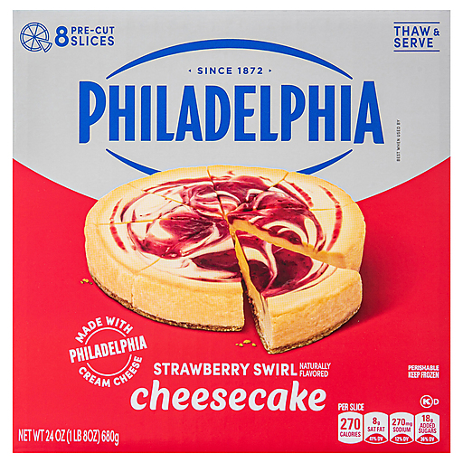 Deliciously creamy and always convenient, Philadelphia presents our Philadelphia Strawberry Swirl Frozen Cheesecake, ready-made and waiting for you in the frozen aisle. Made with Philadelphia Cream Cheese, our cheesecake offers a rich and creamy experience- without the work. Available in two flavors, Original and Strawberry Swirl, each cheesecake comes pre-cut into 8 slices. The hand-pressed graham cracker crumb crust adds the perfect balance of texture to the rich cheesecake filling, topped with hand-swirled strawberry flavor ribbons. With no artificial flavors or dyes, our ready-made cheesecake delivers quality you can trust from the brand that invented cream cheese. To enjoy, simply thaw in the refrigerator for at least 12 hours, unwrap, and serve. With Philadelphia Strawberry Swirl Cheesecake, you get the Philadelphia taste you love, the quality you expect, and the convenience of pre-sliced frozen cheesecake.