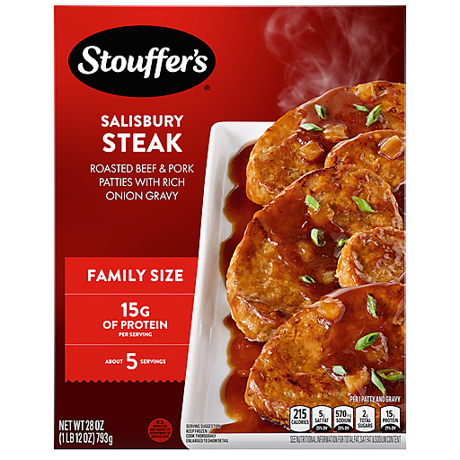 Gather around the table with your loved ones when you serve Stouffer’s Family Size Salisbury Steaks -- make dinnertime a joyful moment with homestyle food. Thoughtfully crafted with flavorful, quality ingredients, our Salisbury Steaks are made with roasted beef & pork patties, with a rich onion gravy. Whether you’re looking for after-work dinner ideas, or you need some easy comfort food, this Salisbury steak family dinner is the perfect way to solve your ‘what’s for dinner?’ dilemma. With a Stouffer’s frozen Salisbury steak in your freezer, you’ll always be ready to enjoy something delicious. Keep the steaks in your freezer until you’re ready to cook and serve.