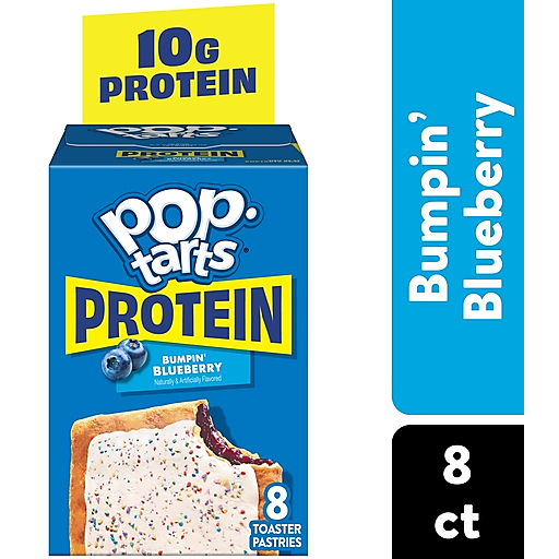 Same flavor, great taste - leveled up! Power up your snack time with Pop-Tarts Protein Bumpin' Blueberry toaster pastries. These craveworthy Pop-Tarts pastries deliver the classic flavor you love with 10g of protein per serving (11% daily value). This sweet option is packed with gooey blueberry-flavored filling, wrapped in a golden pastry crust, and topped with frosting, and colorful sprinkles. They're perfect anytime you're looking for options for the whole family on the go. Whether it's a quick part of breakfast heading out the door or a mid-morning snacking option, they help fuel your day. Enjoy them perfectly toasted for a warm, crispy crust, microwaved for a convenient protein snack choice, or straight from the pouch when it's on the go snack time. Pack into a lunch box for a tasty school snacks option, or stock your office pantry for afternoon cravings. No prep, no mess. Try Pop-Tarts Protein Bumpin' Blueberry for a Crazy Good way to get protein without sacrificing taste.