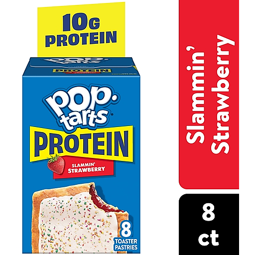 Same flavor, great taste - leveled up! Power up your snack time with Pop-Tarts Protein Slammin' Strawberry toaster pastries. These craveworthy Pop-Tarts pastries deliver the classic flavor you love with 10g of protein per serving (11% daily value). This sweet option is packed with gooey strawberry-flavored filling, wrapped in a golden pastry crust, and topped with frosting, and colorful sprinkles. They're perfect anytime you're looking for options for the whole family on the go. Whether it's a quick part of breakfast heading out the door or a mid-morning snacking option, they help fuel your day. Enjoy them perfectly toasted for a warm, crispy crust, microwaved for a convenient protein snack choice, or straight from the pouch when it's on the go snack time. Pack into a lunch box for a tasty school snacks option, or stock your office pantry for afternoon cravings. No prep, no mess. Try Pop-Tarts Protein Slammin' Strawberry for a Crazy Good way to get protein without sacrificing taste.